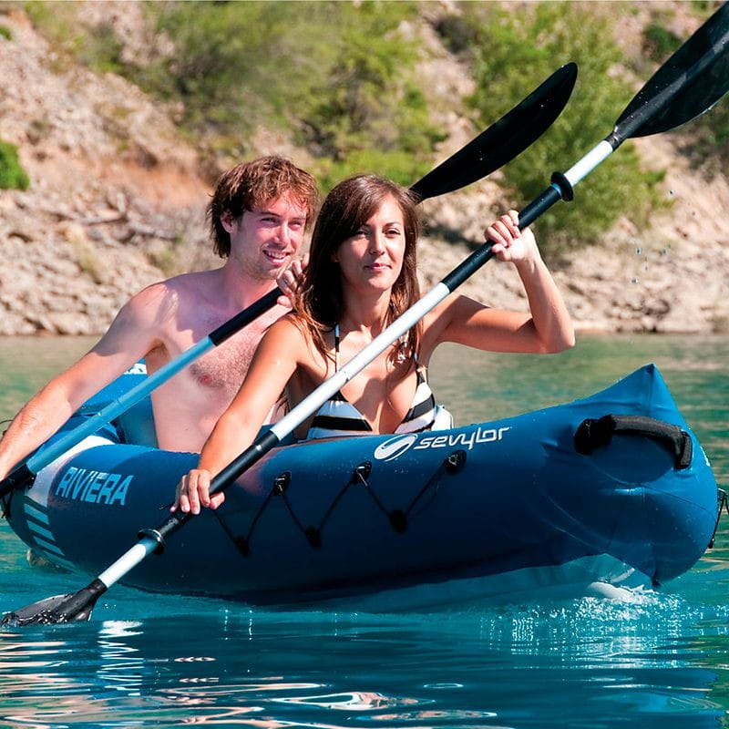Rekreacyjny kajak dla 2 osób, świetnie nadaje się na wycieczki po rzekach i jeziorach. Lekki i nieduży, po spakowaniu łatwo się mieści w bagażniku samochodu. Konstrukcja: dwie boczne komory, materiał PVC, system Back Pack System, uchwyty transportowe, zawory Bostońskie. Wiosło w zestawie.