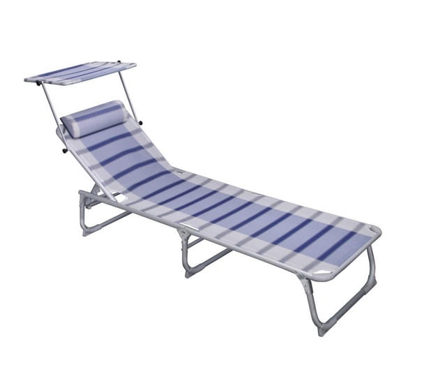 Leżak Tintoretto niebieski w paski. Leżak posiada podgłówek oraz daszek chroniący przed słońcem. Obciążenie: do 120 kg; Wymiary: 188 x 59 x 30 cm; Wymiary po złożeniu: 79 x 59 x 20 cm