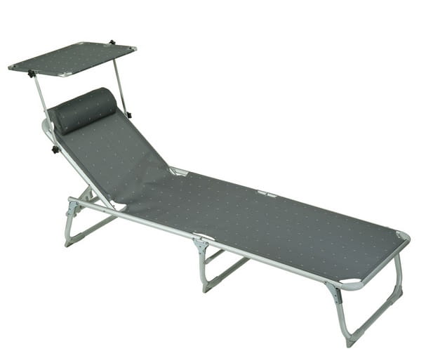 Leżak Tintoretto szary. Leżak posiada podgłówek oraz daszek chroniący przed słońcem. Obciążenie: do 120 kg; Wymiary: 188 x 59 x 30 cm; Wymiary po złożeniu: 79 x 59 x 20 cm