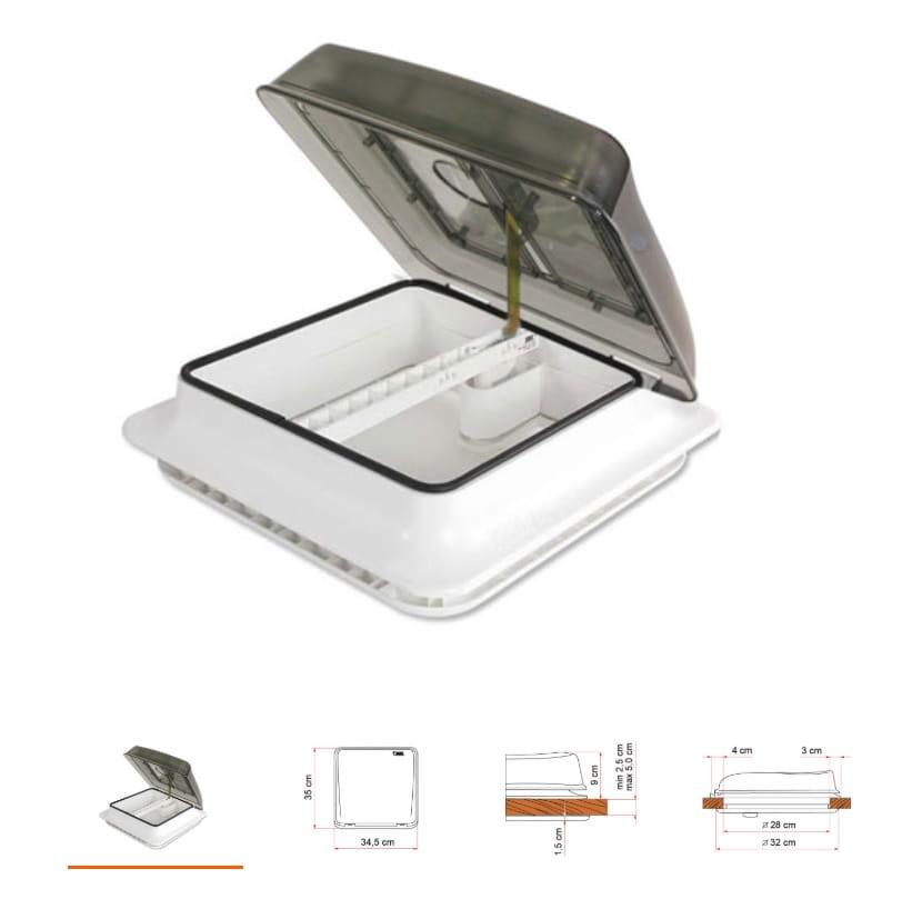 Okno dachowe Vent 28 x 28 z pokrywą przeźroczystą "CRISTALL" firmy Fiamma uchylne z moskitierą.