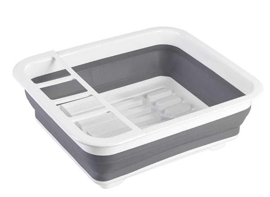 Składana silikonowa suszarka do naczyń. Z uchwytem na sztućce i talerze, kubki, miski i inne naczynia. Po złożeniu suszarkę można schować, aby zaoszczędzić miejsce. Wymiary: 37x31x6 / 13cm, kolor: biało-czarny, materiał: PP / TPR
