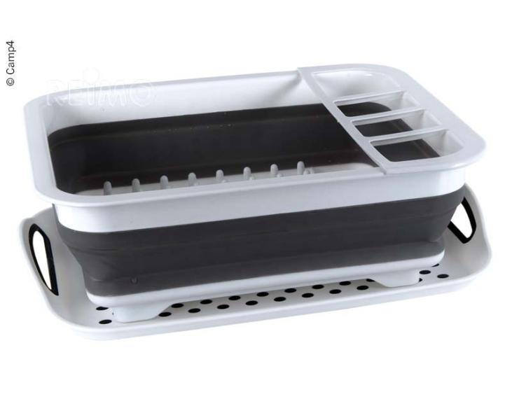 Składana silikonowa suszarka do naczyń. Z uchwytem na sztućce i talerze, kubki, miski i inne naczynia. Po złożeniu suszarkę można schować, aby zaoszczędzić miejsce. Gumowana, antypoślizgowa taca ociekowa może być również używana jako taca.