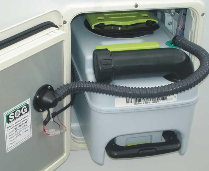 System wentylacji toalety SOG zasilany na 12V to system odpowietrzania toalety - usuwania gazów tworzących się w zbiorniku na fekalia, działający bez niepotrzebnej woni lub chemii. Bezproblemowo montowany w każdej przyczepie lub kamperze, ledwie słyszalny, dzięki pracy z wysokowydajnym, specjalnie opracowanym systemem odpowietrzenia. Włącza się on tylko podczas korzystania z toalety, co skutkuje czemu zmniejszonym zużycie prądu.