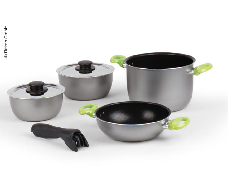3 garnki średnicy do 16, 18 + 22 cm, 1 patelnia, 2 pokrywki, 1 uchwytu.