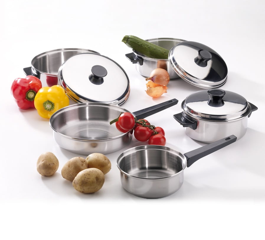 Zestaw garnków 8 elementów wykonanych ze stali nierdzewnej.
