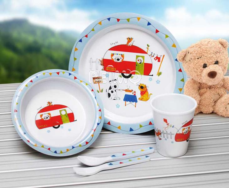 Zestaw naczyń dla dzieci w 100% bezpieczny dla małych pociech. Opis produktu: 1 talerz Ø22cm, 1 miska Ø16cm , 1 kubek 200 ml, 1 + 1 widelec nóż.
